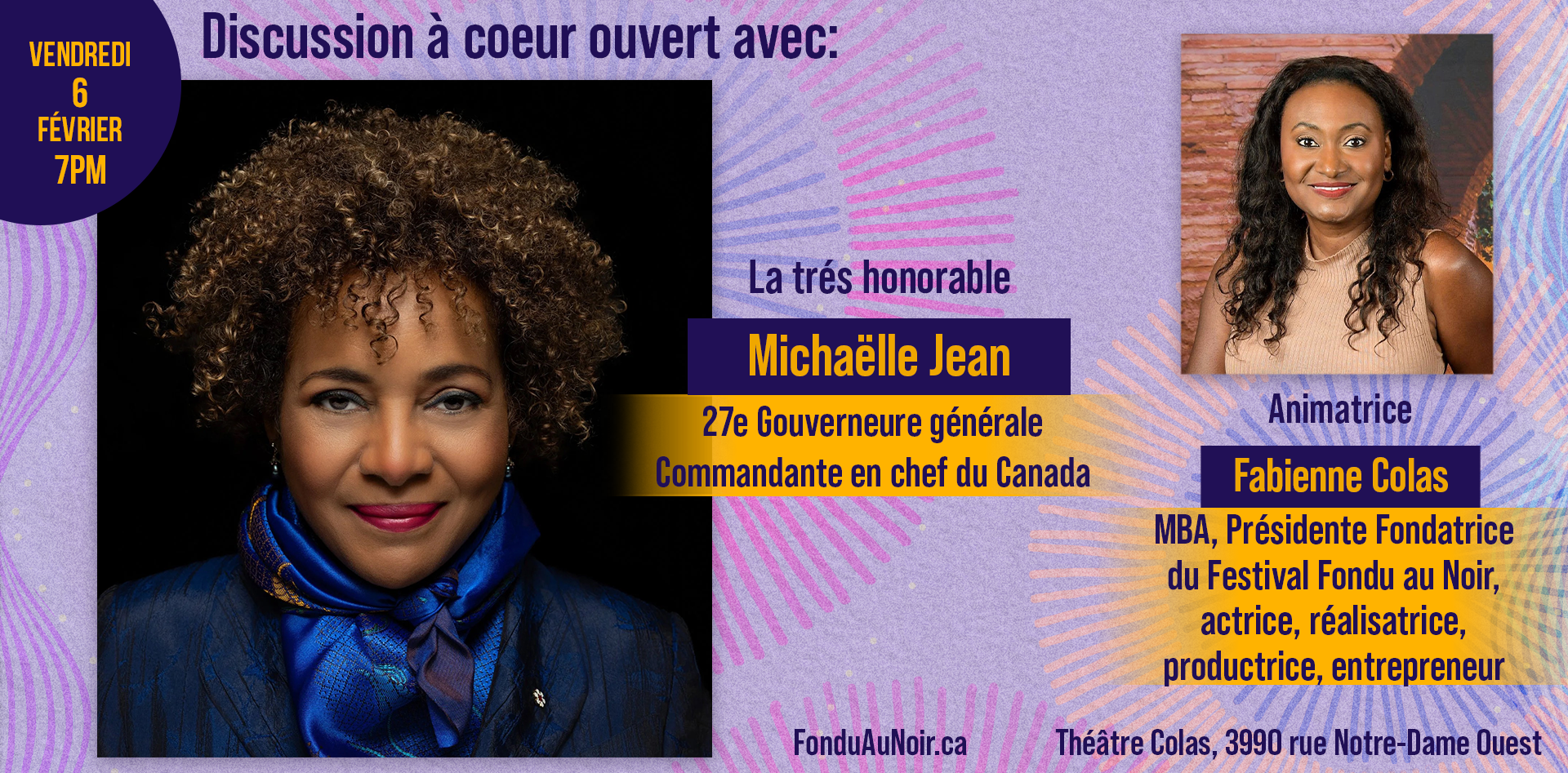À l’occasion de sa 15e édition, le Festival Fondu au Noir est honoré d’accueillir l’honorable Michaëlle Jean à titre de Présidente d’honneur. Figure emblématique de l’engagement citoyen, humanitaire et culturel, elle incarne un parcours remarquable marqué par l’excellence et la détermination. Son cheminement migratoire, de Haïti au Canada, a profondément nourri son regard sur les enjeux de justice sociale, de diversité et de dialogue interculturel. Ancienne Gouverneure générale du Canada, elle célèbre cette année les 20 ans de sa nomination, une étape marquante de l’histoire canadienne. Sa carrière engagée et prolifique témoigne d’un engagement constant en faveur des droits humains, de la culture et de la francophonie. Sa présence s’inscrit également dans la célébration des 30 ans du Mois de l’histoire des Noirs, soulignant l’importance de la mémoire, de la reconnaissance et de la transmission.