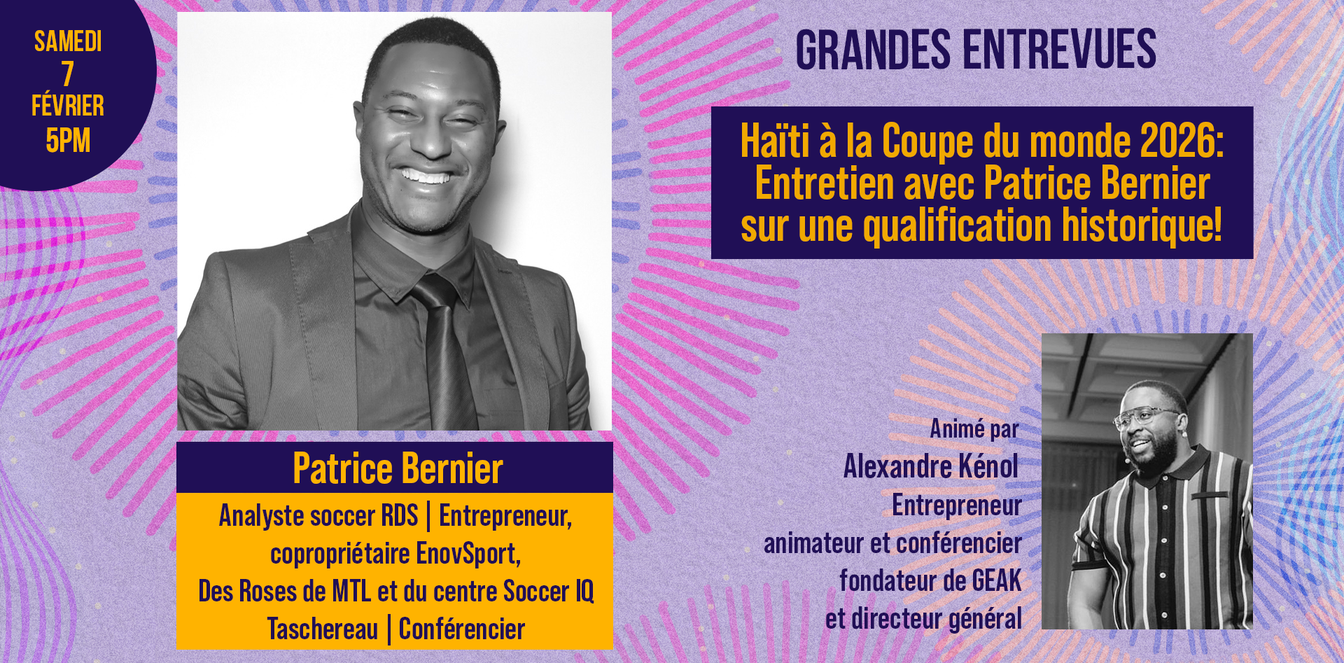 Cet entretien entre Patrice Bernier et Alexandre Kénol, célèbre la fierté de la diaspora haïtienne et la résilience du peuple haïtien à travers la qualification historique pour la coupe du monde 2026. L’objectif est de revenir sur les moments clés du parcours qui ont mené à cet exploit en soulignant l’impact de cette réussite sur l’unité et l’identité nationale. Il explore également les perspectives et l’avenir du soccer haïtien après cette performance exceptionnelle. Enfin, Patrice Bernier partagera sa vision pour soutenir et faire grandir le football en Haïti.
