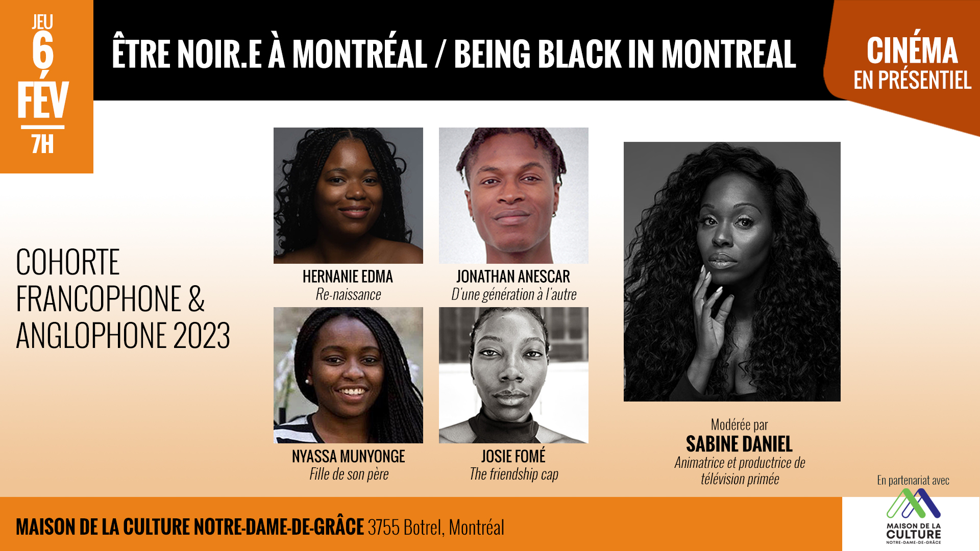 Les 4 participants de l’édition 2023 ont bénéficié du programme de mentorat Être Noir au Canada de la Fondation Fabienne Colas en accompagnement cinématographique – présenté par Netflix, en collaboration avec la Banque Nationale, et supporté par Téléfilm Canada, le Fonds des médias du Canada et le Conseil des arts du Canada.