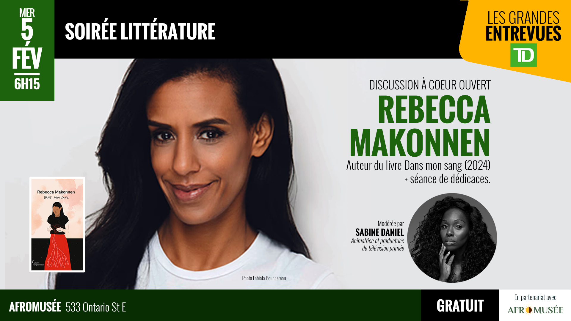 La discussion avec Rebecca Makonnen sera animée par Sabine Daniel, animatrice et productrice primée.